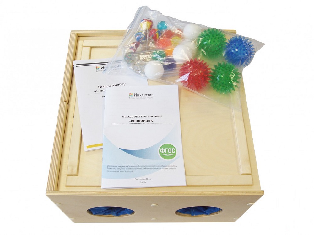 Деревянный ящик с крышкой, внутренние перегородки которого, позволяют разделить его на 2 или 4 зоны, отверстия в боковых стенках имеют текстильные рукава; 24 шара (6 видов по 4 штуки), методическое пособие «Коррекционно-педагогическая работа по сенсорному развитию детей дошкольного возраста», методическое руководство по использованию набора.