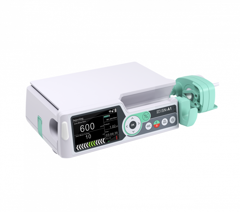 Шприцевой одноканальный насос с сенсорным управлением модели SN-A1 используется в медицине для процедуры дозированной инфузии лекарственных веществ и питательных смесей в организм человека. Ввод иглы насоса выполняется автоматически, однако все характеристики процедуры, в том числе скорость и объем инъекции, устанавливаются врачом.